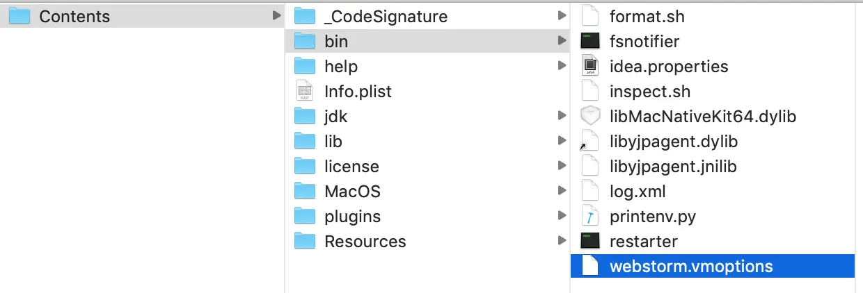 /Library/JetbrainsLicense(笔者存放的 Library 文件夹是系统根目录下的, 需要读写权限的, 所以没有读写权限的朋友不要放在这里, 常规文件夹如‘文档’、‘下载’等等都可以,否则会出现 ‘Key is invalid’的提示)- 通过应用程序,右键打开内容找到 ./Contents/bin/*.vmoptions文件,用编辑器打开: