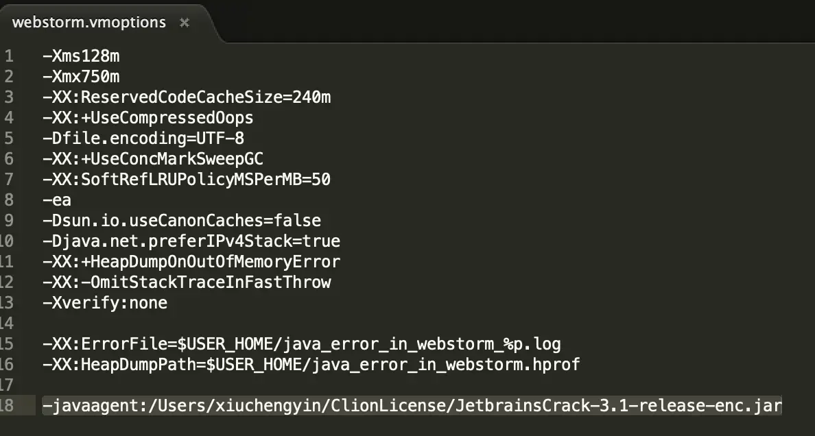 添加:-javaagent:/Users/xiuchengyin/ClionLicense/JetbrainsCrack-3.1-release-enc.jar