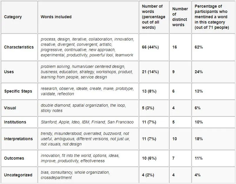 除了对设计思维的自由联想,研究还要求参与者用自己的语言来定义设计思维。大多数的回答可以归为以下一个或几个类别。