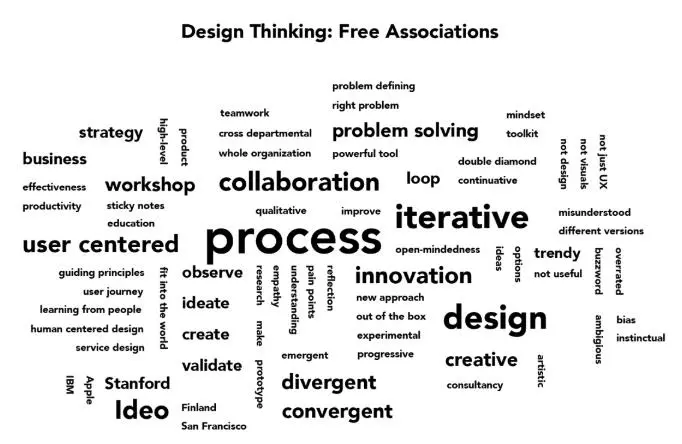 虽然设计思维可能没有一个明确的、被广泛使用的定义,但人们在如何概念化设计思维方面却有着意想不到的统一。62%的研究参与者将特征相关词语与设计思维联系在一起,不仅如此,他们还倾向于使用相同的词语。