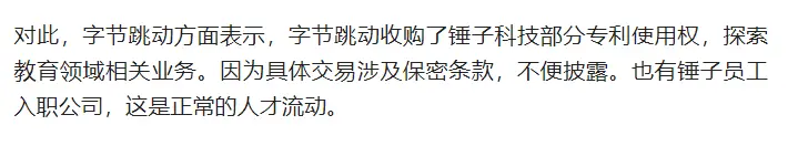 **条件二:**按照字节的官方说法,收购锤子科技部分专利使用权计划,用于探索教育领域相关硬件。那就是只对锤子的这些相关感兴趣,专利 、相关软件、相关人才等,也不是真的“全部接盘”,负债那么多,烂摊子那么大,全接盘没那个必要啊。