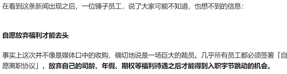**条件一:**要求改签劳动合同到今日头条的母公司“字节跳动”,条件是“会签放弃锤子的假期、股权,然后再签6个月试用期”。这就等于从头再来了……