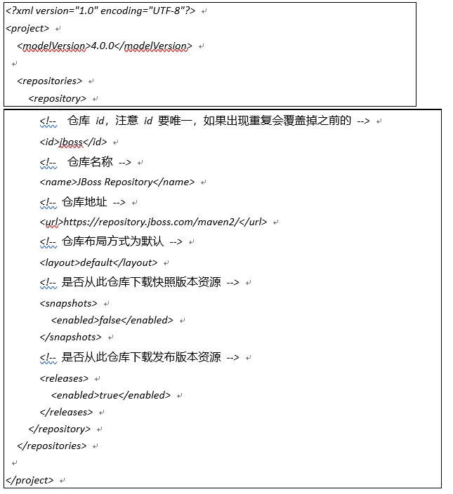 如果默认的中央仓库无法满足项目需求,可能需要的构件在另外一个远程仓库,如 JBoss Maven 仓库,可以 POM 中配置该仓库。