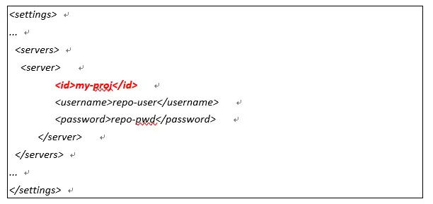 有时候处于安全考虑,需要提供认证信息才能访问一些远程仓库。为了能让 maven 访问仓库内容,就需要配置认证信息,认证信息的配置不会在 pom.xml 配置,而是在 settings.xml 中配置,因为 pom 会被提交到代码仓库中供所有成员访问,而 settings.xml 一般只放在本机。(此配置常用于私服应用,后续会有详细讲解)假设我在 pom.xml 中配置 id=my-proj 的远程仓库,需要认证信息,则在 settings.xml 中配置如下: