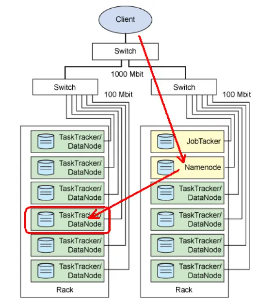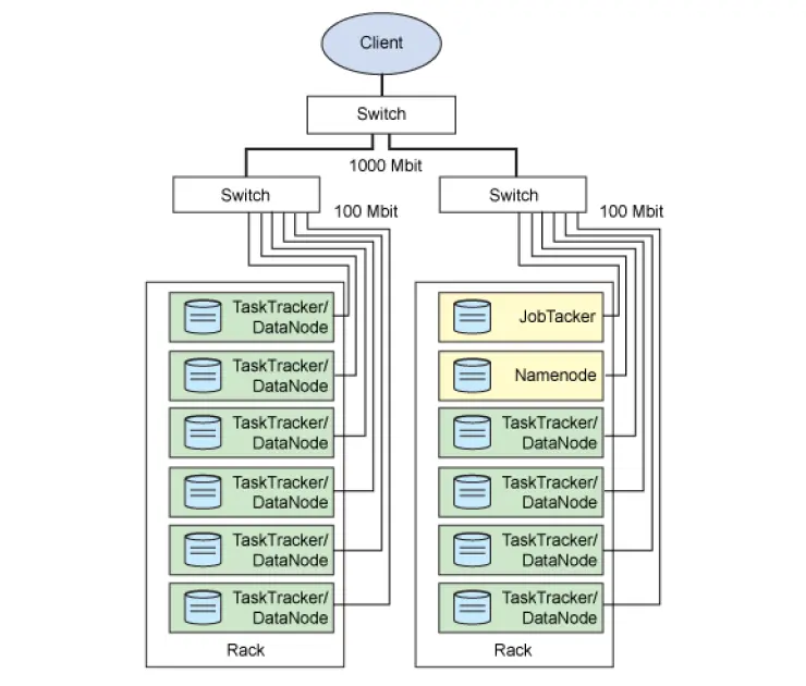 如图,两个服务器机柜,每个圆柱代表一个物理机,各个物理节点通过网线连接,连接到交换机,然后客户端通过互联网来访问。其中各个物理机上都运行着Hadoop的一些后台进程。