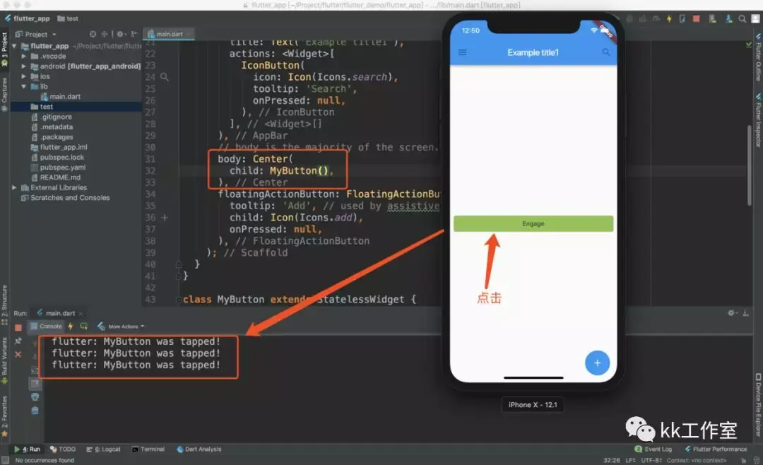 class TutorialHome extends StatelessWidget { @override Widget build(BuildContext context) { // Scaffold is a layout for the major Material Components. return Scaffold( appBar: AppBar( leading: IconButton( icon: Icon(Icons.menu), tooltip: 'Navigation menu', onPressed: null, ), title: Text('Example title'), actions: <Widget>[ IconButton( icon: Icon(Icons.search), tooltip: 'Search', onPressed: null, ), ], ), // body is the majority of the screen. body: Center( child: Text('Hello, world!'), ), floatingActionButton: FloatingActionButton( tooltip: 'Add', // used by assistive technologies child: Icon(Icons.add), onPressed: null, ), ); }}四、手势处理