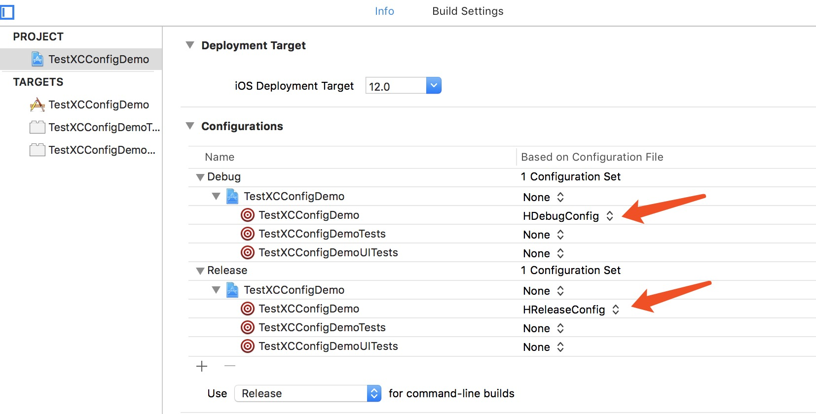 2、创建好文件之后,切换到PROJECT—->info—>Configurations下,对应的target下,分别配置Debug和Release模式下对应的.xcconfig配置文件,直接选择.xcconfig对应的文件名字即可