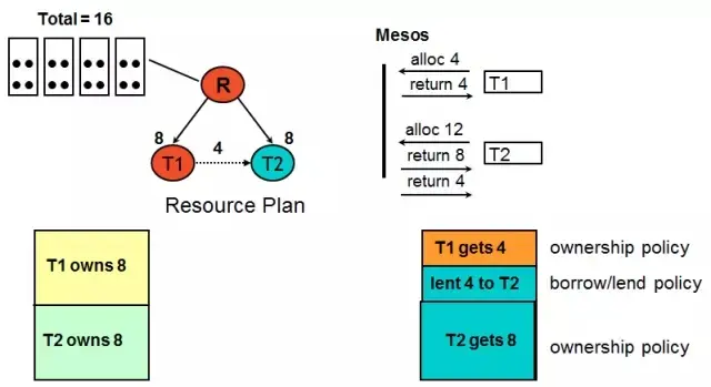 上图是BlueDock的一个简单的改进的资源借入借出的一个例子。现在有两个tenant,T1和T2,都独占8个资源,但是我们看到在T1和T2之间有个虚线,这个虚线表示T2可以从T1借入4个资源。所以当T1和T2去申请资源的时候,T1要4个,T2要12个,那T1可以直接拿到他独占的4个资源,T2要12个,但是他只独占8个资源,所以他会先拿到自己独占的这8个资源。