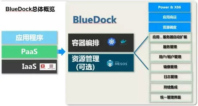 以上是我们容器云的总体概览,最左边是我们很熟悉的云平台的最重要的三层,IaaS、PaaS、SaaS,我们的BlueDock主要是提供PaaS的功能,是基于Kubernetes和Mesos(可选)来研发的。但如果我们建容器云的话,只有这两个是远远不够的,因为容器云里还有很多其他的功能,所以我们围绕着Kubernetes和Mesos,在上面加了很多企业级的东西,包括应用商店,资源调度的改进策略,应用、服务器的双层扩展,多租户管理,镜像管理,统一界面等等。