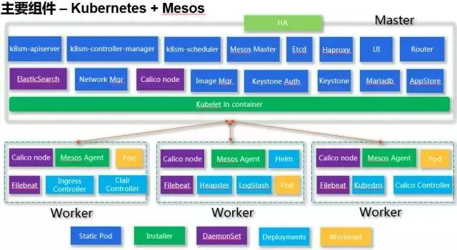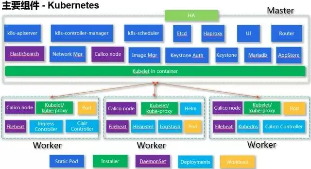 日志管理主要是通过DaemonSet的形式启动了Filebeat,来搜集每个worker的容器日志信息。网络管理主要是通过DaemonSet在每个worker节点启动了Calico node的container,这个container里面包含了Bird路由管理、Felix协议等。其它还有一些组件通过Deployment来管理,例如用于对log进行过滤的logstash,用于对Network Policy进行管理的calico congtroller等等。