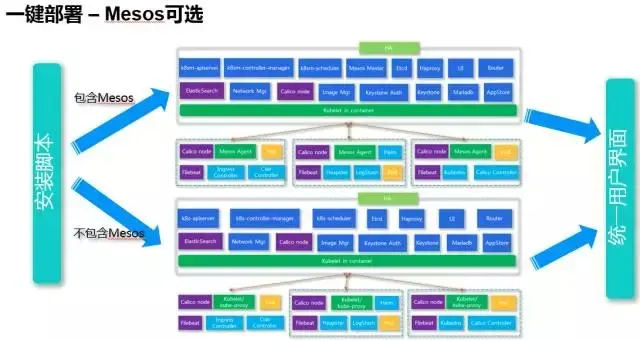 我们IBM的BlueDock就是这样一个容器云平台,主要基于Kubernetes实现了容器的编排和资源调度,并默认使用Mesos作为底层的资源管理器,但如果用户没有运行多个framework的需求,可不使用Mesos。