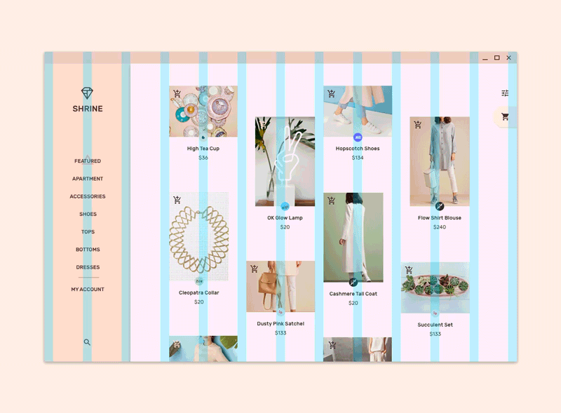 水平网格:在移动和平板端,Shrine通过自定义网格布局来满足水平滚动的需求。列、槽(内间距)和外间距从上到下排列,而非从左到右。