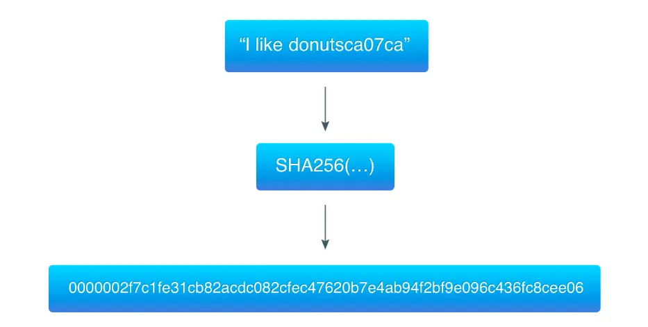 0000008b0f41ec78bab747864db66bcb9fb89920ee75f43fdaaeb5544f7f76ca第一个哈希值(根据“我喜欢甜甜圈”计算)比目标大,因此它不是有效的工作证明。第二个哈希(计算在“我喜欢donutsca07ca”)小于目标,因此它是一个有效的证据。