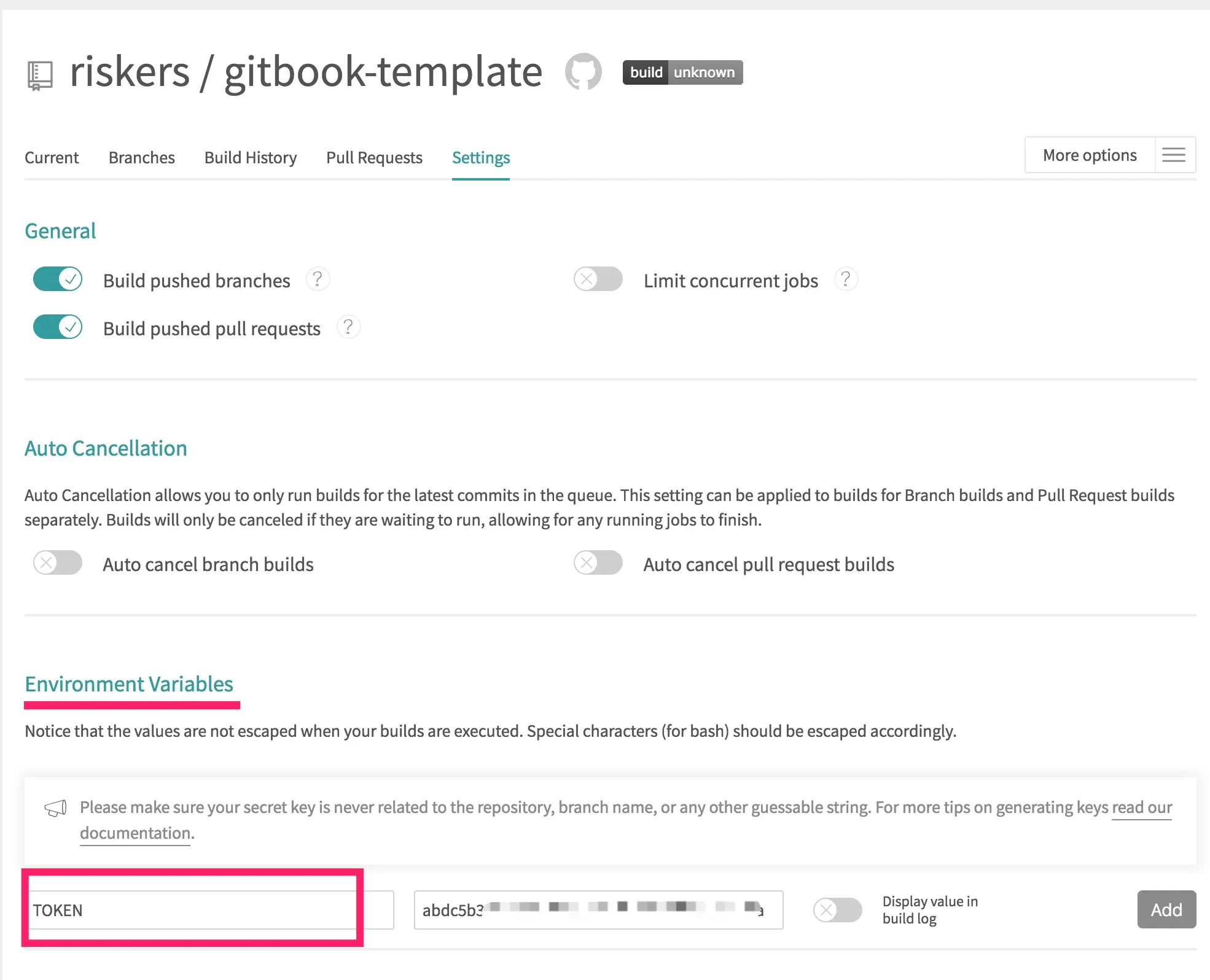 复制生成的 token,填写在 Travis 的设置-全局变量中,并且取名为 TOKEN:
