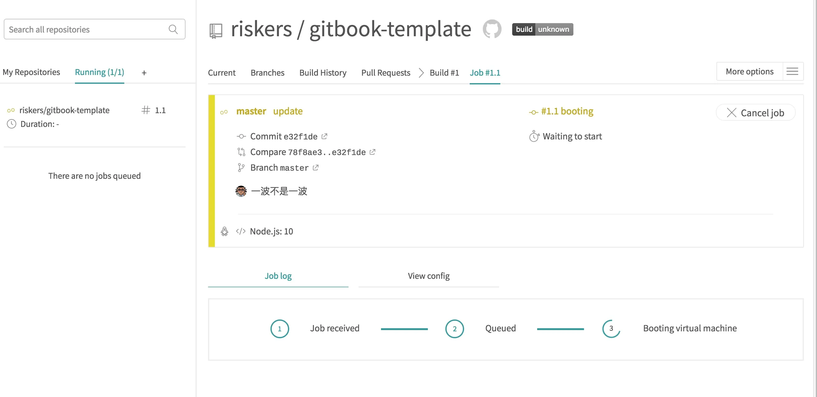 然后 push 上去,可以看到 Travis CI 在跑了: