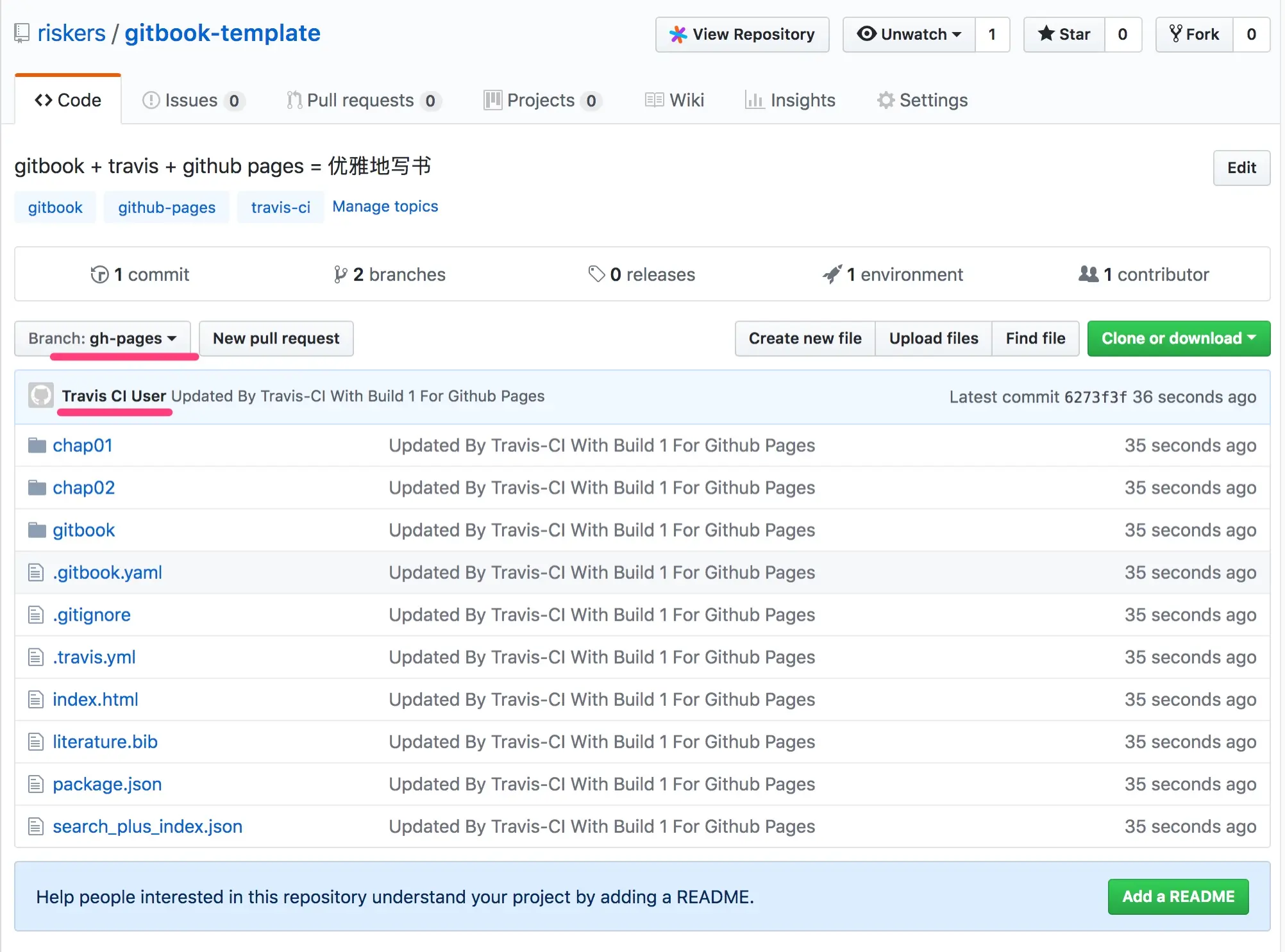 稍作等待,跑完之后,可以在 gh-pages 下看到 Travis CI 给我们推过来了 gitbook build 之后的内容: