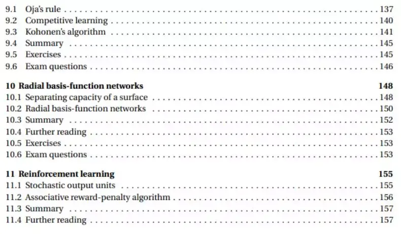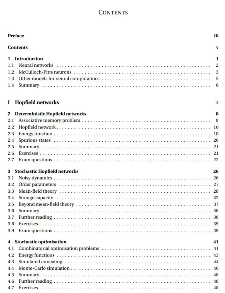 总体而言,这本 157 页的书从 Hopfield 网络Hopfield 网络、监督学习和无监督学习三个主题介绍人工神经网络。其中监督学习介绍了我们熟悉的深度学习,无监督学习介绍了径向基函数网络和强化学习。而第一部分的 Hopfield 网络重点介绍了我们并不熟悉的确定性和随机性 Hopfield 网络,以及「贼复杂」的随机优化,可能对物理学来说这些恰好是简单的东西吧~