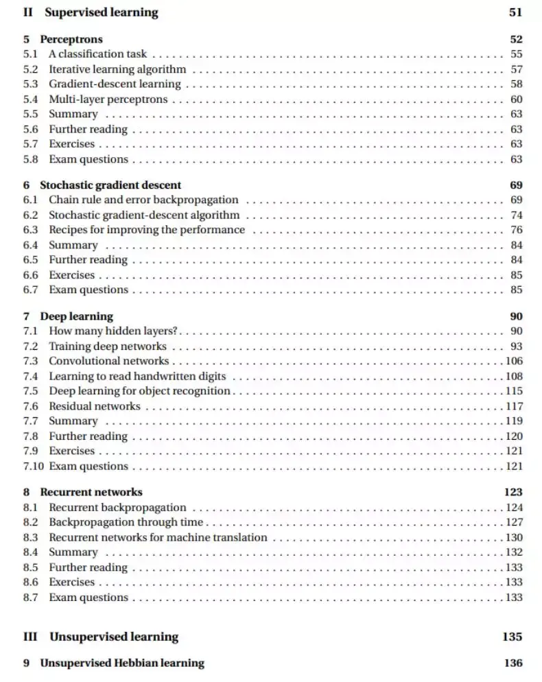 每一部分包含多个章节,且每一个章节都带有练习题和自测题,它们是检验章节掌握度的最好方法。此外从内容上而言,Hopfield 网络是比较有特点的部分,因为像花书《Deep Learning》等流行的教材并不会单独介绍这一内容。可能我们对它的理解还是根据 Hinton 2012 的神课而获得,即 Neural Networks for Machine Learning。所以如果想要了解早期人工神经网络的研究与发展,那么看这一部分就对了。