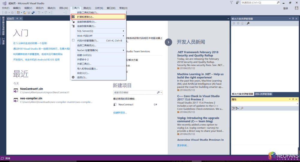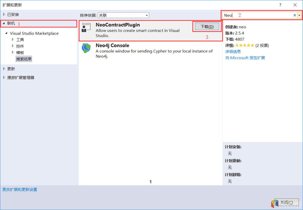 打开 Visual Studio 2017,打开 工具, 扩展和更新,在左侧点击 联机,搜索 Neo,安装 NeoContractPlugin插件(该过程需要联网):