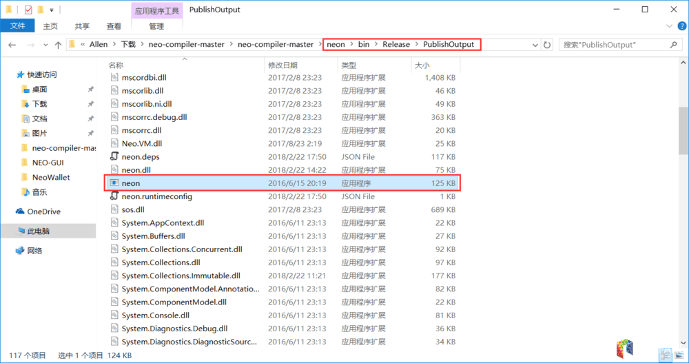发布成功后,会在 bin\Release\PublishOutput目录下生成 neon.exe文件: