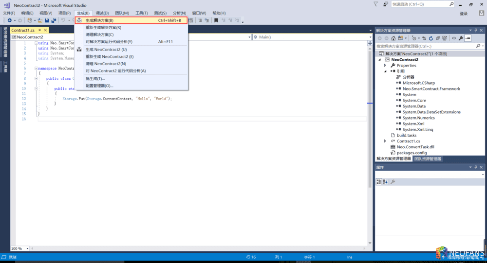 创建项目好后,会自动生成一个 c# 文件,默认的类继承于 SmartContract:
