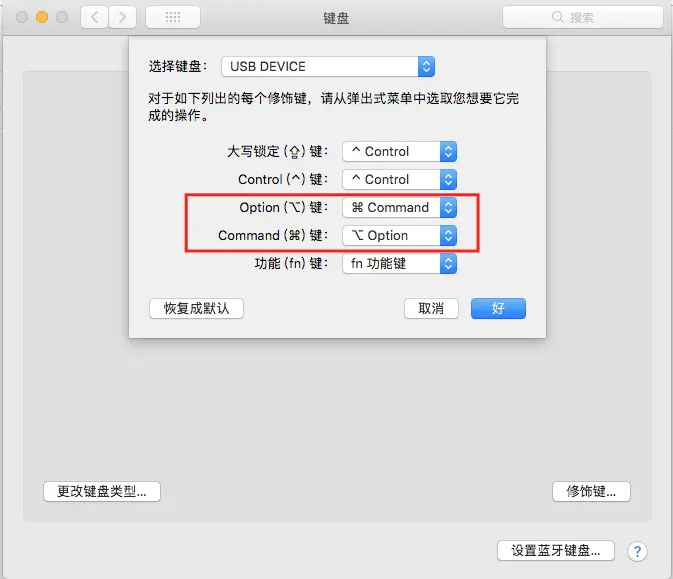 如果你使用了mac相关的电脑并外接了非苹果键盘,需要注意一下 command键和option的位置. 更为标准且习惯的方式应该是 alt设置为command键,win设置为option键.