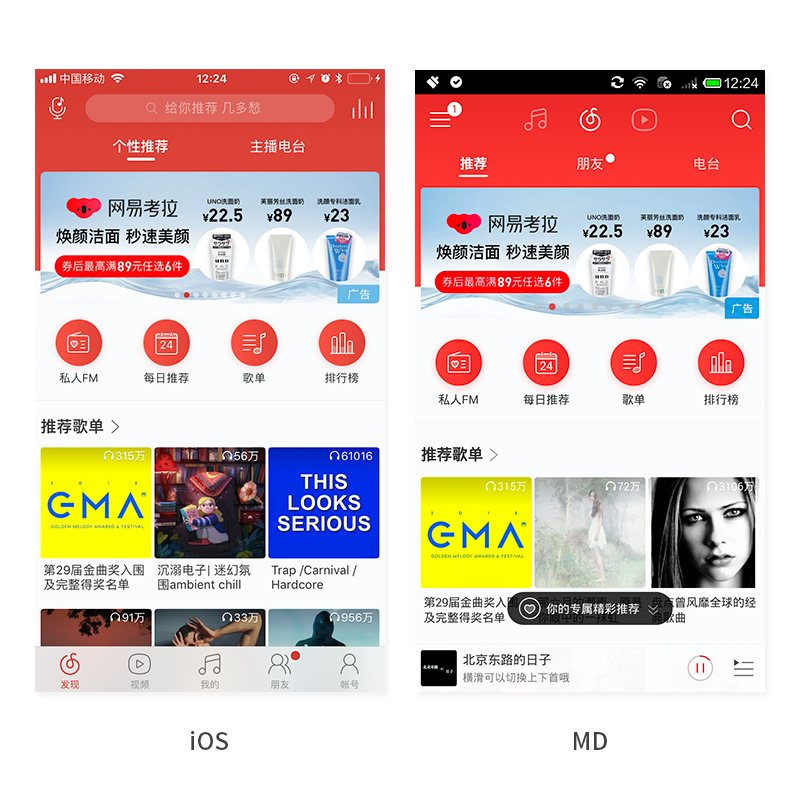 网易云音乐在iOS中采用的是底部栏菜单导航,而在安卓机型上导航栏被移到界面顶部,“账号”被收到侧边栏中。