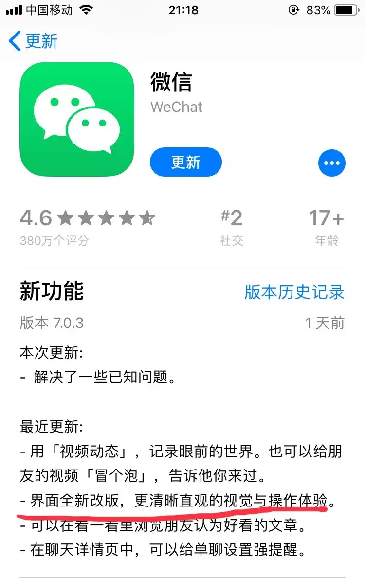 就在昨天「2019年1月22日」晚上,微信再次发布IOS 7.0.3 更新,虽然这次更新说明只是修复部分Bug,但还是有一重大改变的,接下来一一道来。