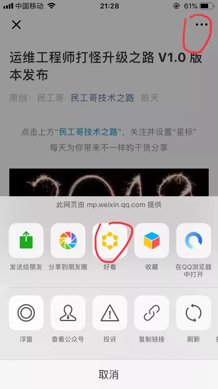 新增好看入口自从7.0改版后,文章的「点赞」变成了「好看」,文章点「好看」的入口仍然是文章底部右侧位置。
