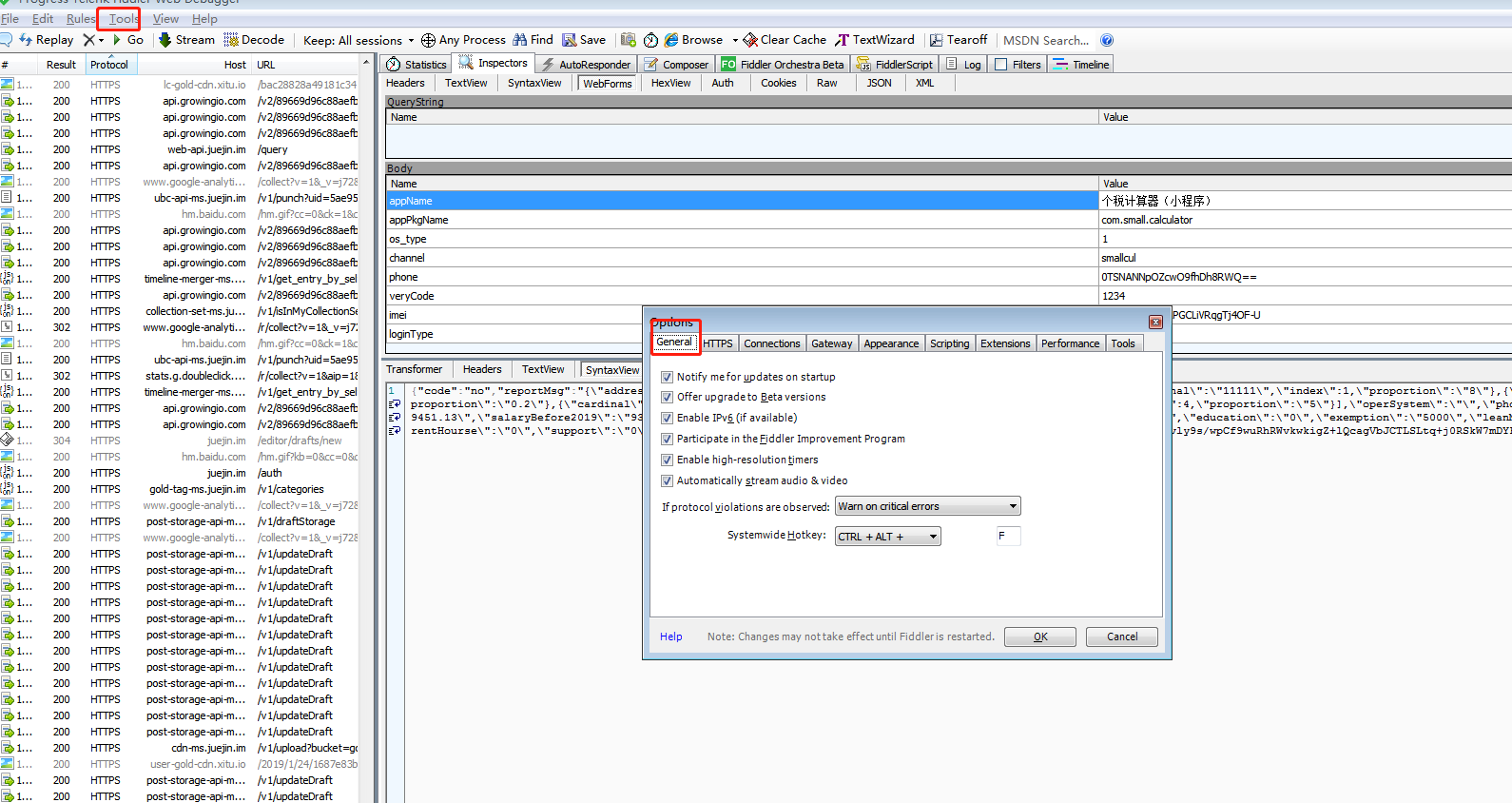 Fildder抓包安装教程 guosen 2019-01-24 772 阅读1分钟 1.安装Fildder 上官网下载Fildder执行文件并安装,然后进行一些配置信息的修改,重启成效 允许远程连接 修改默认端口号 2.手机安装证书 确保手机和电脑在统一局域网,手机浏览器打开电脑ip加上述修改的端口号,下载证书 安装完,点开手机设置》通用》描述文件 就能找到刚刚安装的证书,信任它。 点开手机设置》关于本机》证书信任设置,把状态打开。 3.开始抓包 手机wifi点开,打开http代理,服务器设置电脑IP,端口设置fildder设置的端口 可以愉快地访问app、网站进行抓包了。 微信内小程序得打开调试才能抓包