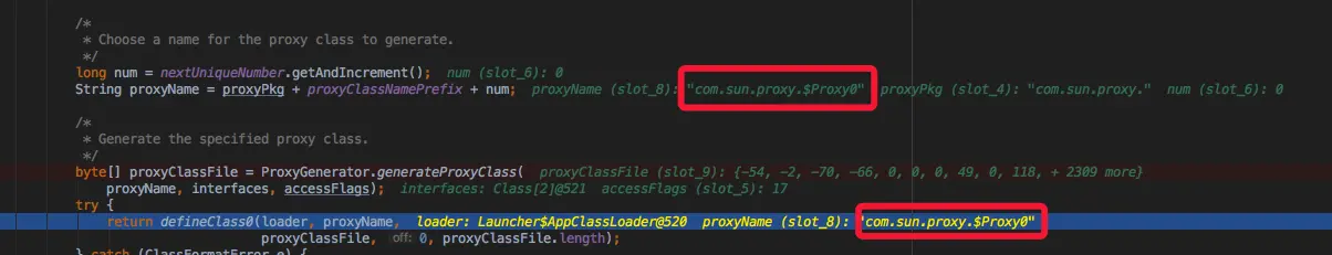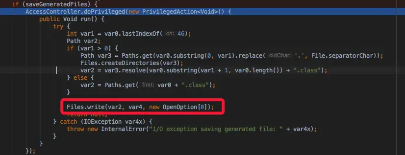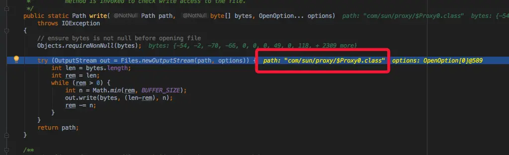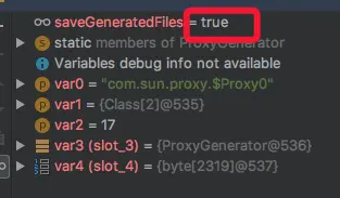然后我们再看下 if (saveGeneratedFiles) {}这个地方,看这里一堆var头疼,但是这里的代码意思是if true的话会保存一份文件(追到这里可以猜测,文件应该是生成的代理类的.class文件了),那我们还是Debug一下这个地方,看有没有进行保存,保存的文件又在哪里?这是就扯到怎么看查看生成的代理类的.class文件了,下面开个栏再说。