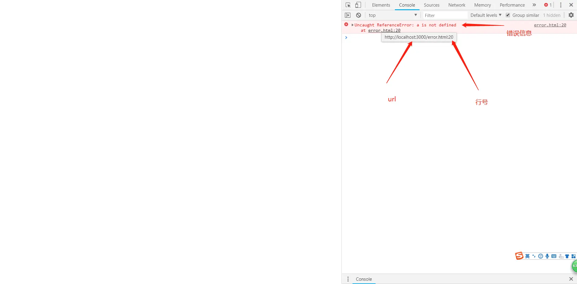 - 打开chrome的控制台,查看console面板。控制台中显示着错误消息、错误的 URL 和错误的行号