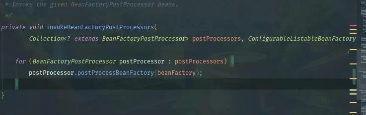 可以看到这个for循环里对BeanFactoryPostProcessor实现类进行了调用。