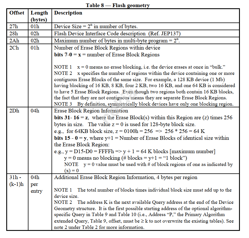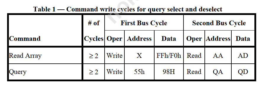 - 第2/3列表示以chip最大总线位宽为单位时,向chip发送地址/command code时的格式。Query 模式下,data只是使用数据总线的低8位(D7 - D0),总线的高位置为0。因此发送98H Query command code时,16-bit总线时为0098h, 32-bit总线时为00000098h