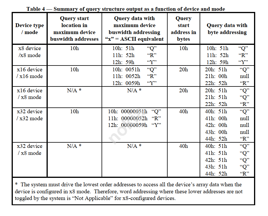 下表表示不同device type/device mode的情况下,让chip进入query mode的地址和command code的差别