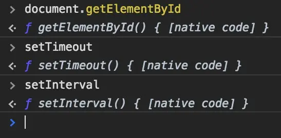 你曾经有没有在控制台中写过像 document.getElementById 这样的命令以及 setTimeout 和 setInterval 之类的代码并看到打印出的结果?他们的实现结果是 [native code] , 这是什么意思呢?可以发现,当你执行这些方法时,它们不会调用任何 JavaScript 代码。反而,这些方法会直接调用到本机的C ++代码。所以其实浏览器不允许JS使用桥接与主机操作系统进行通信,而是使用本机代码直接向系统暴露JS接口!简而言之,这就是 React Native Fabric 将要做的事情:消除桥接通信并且使用本机代码直接通过JS线程控制UI。