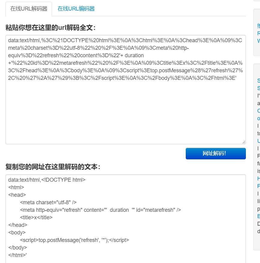 iframe.src = 'data:text/html,%3C%21DOCTYPE%20html%3E%0A%3Chtml%3E%0A%3Chead%3E%0A%09%3Cmeta%20charset%3D%22utf-8%22%20%2F%3E%0A%09%3Cmeta%20http-equiv%3D%22refresh%22%20content%3D%22'+ duration +'%22%20id%3D%22metarefresh%22%20%2F%3E%0A%09%3Ctitle%3Ex%3C%2Ftitle%3E%0A%3C%2Fhead%3E%0A%3Cbody%3E%0A%09%3Cscript%3Etop.postMessage%28%27refresh%27%2C%20%27%2A%27%29%3B%3C%2Fscript%3E%0A%3C%2Fbody%3E%0A%3C%2Fhtml%3E';