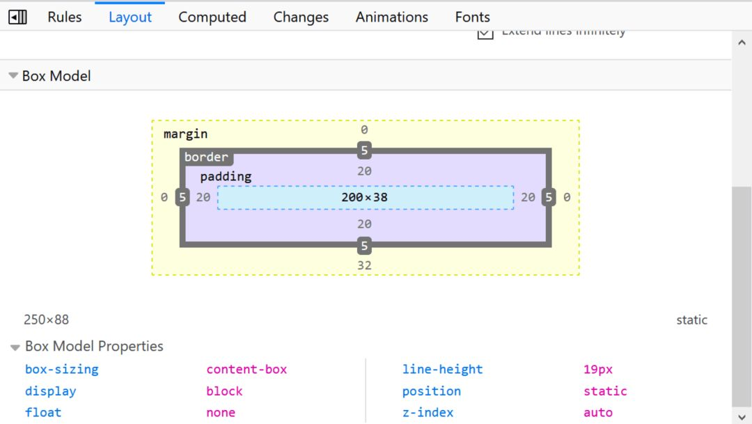 浏览器开发者工具可以再次帮助你了解正在使用的盒子模型。 在下图中,我使用火狐浏览器的开发者工具使用默认的内容框框模型检查框。 工具告诉我这是正在使用的盒模型,我可以看到大小以及如何将边框和内边框添加到指定的宽度。