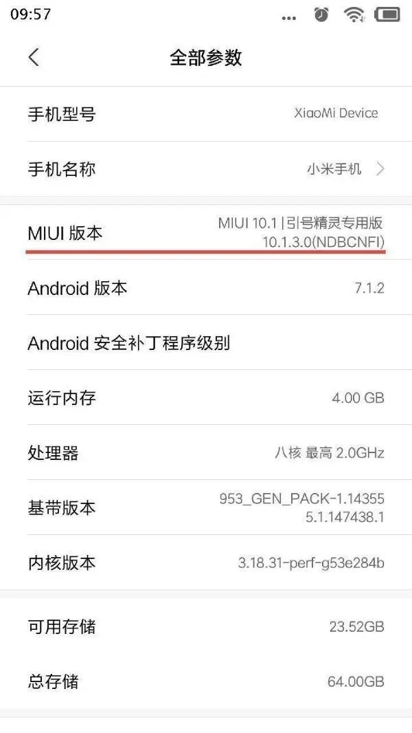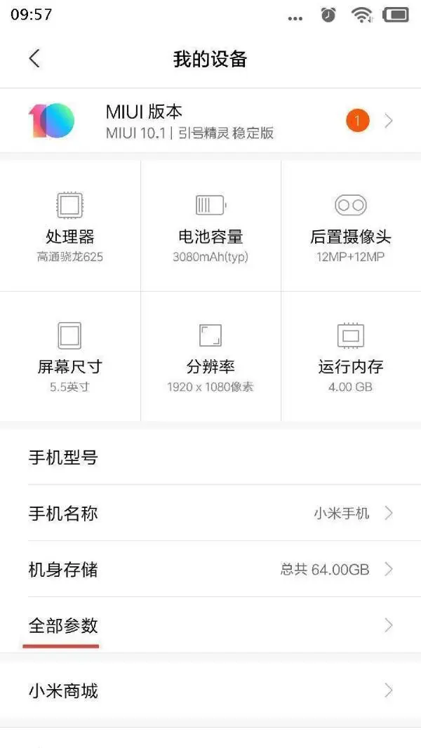 第四步,进入到“全部参数”界面之后,连续点击miui 版本一栏,直到看出弹出您已进入开发者模式的提示文字。