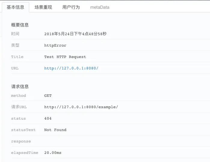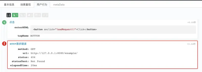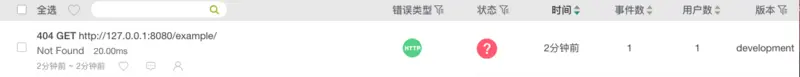 点击该错误,可以查看报错详情。一个http的get请求访问http://127.0.0.1:8080/example/,然后返回404。当然,http的请求错误类型有很多,不仅可以抓404, 什么401啊,403啊,500啊等等都能抓过来。