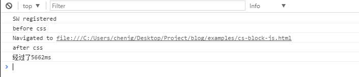 由上图我们可以看到,当css还没加载完成的时候,h1并没有显示,但是此时控制台输出如下