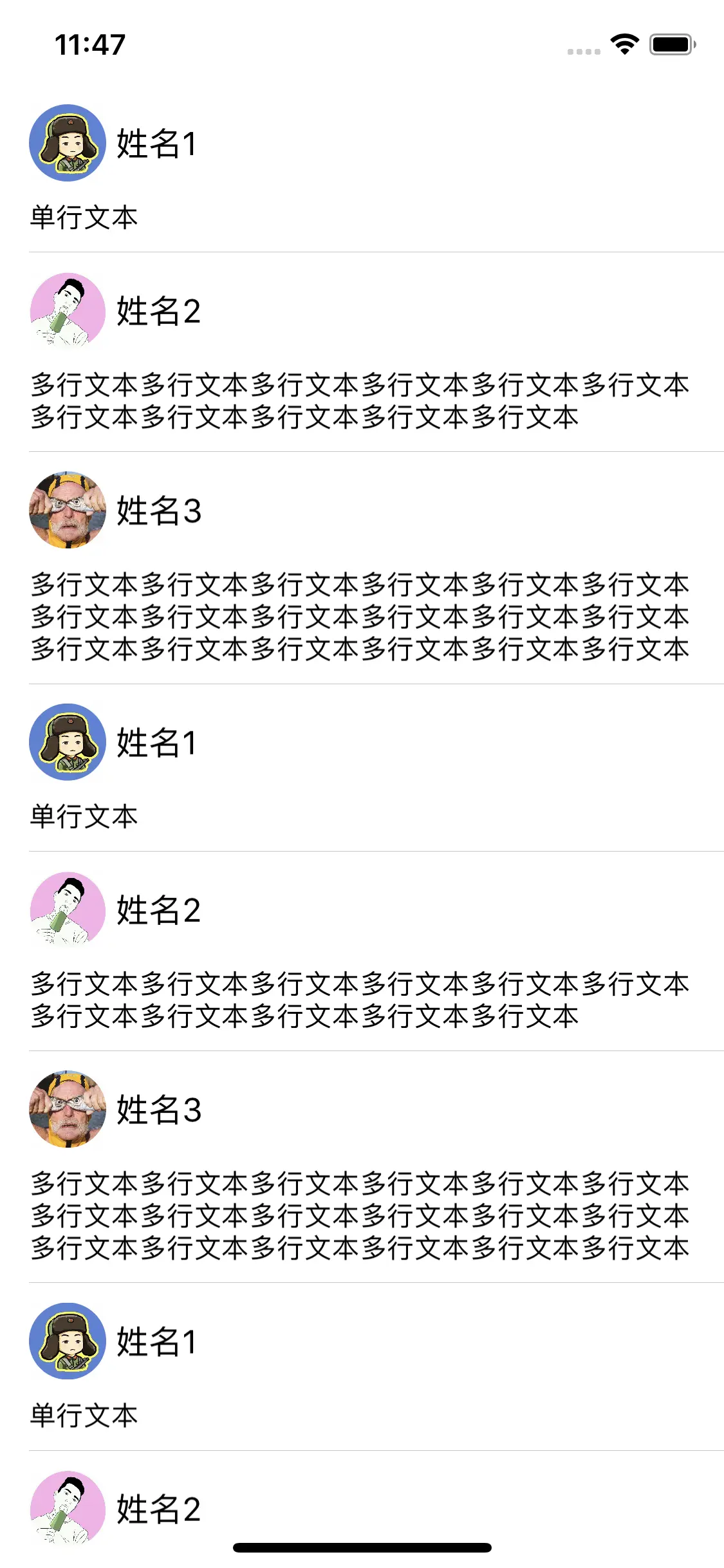 这里面给出了一个显示可变高度的列表的案例,这样的案例比较具有通用性,有图片的加载、有高度不固定文本的显示、有高度不固定CellHeight的计算等等。下面针对这样的案例,从各种角度来比较分析在不同的开发方式下的比较。