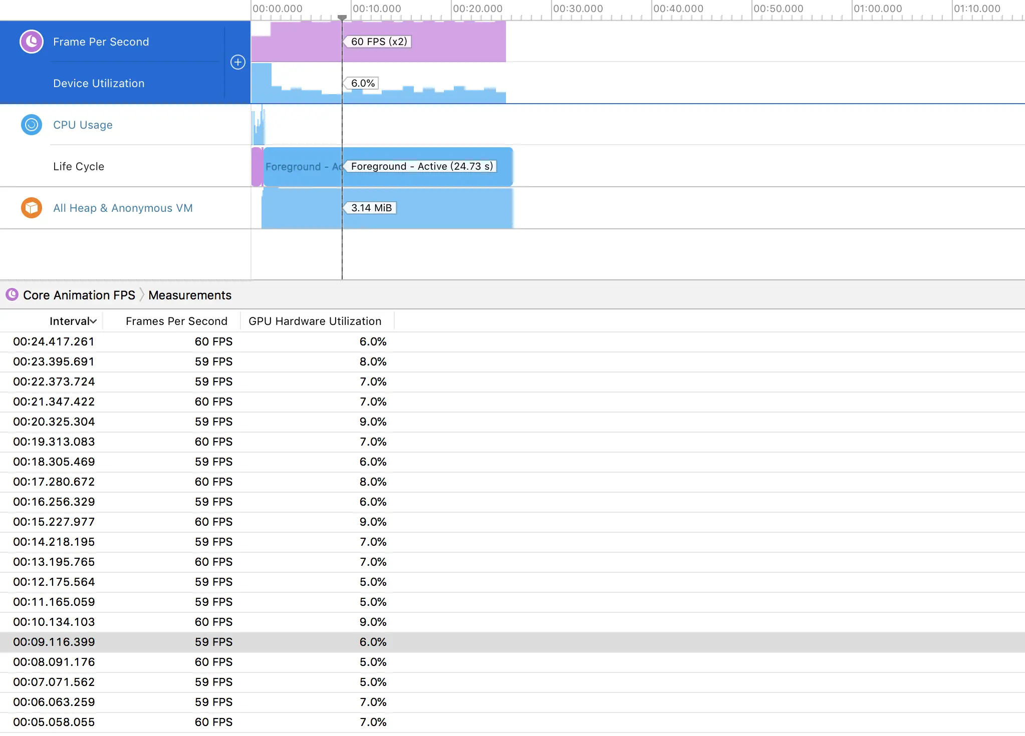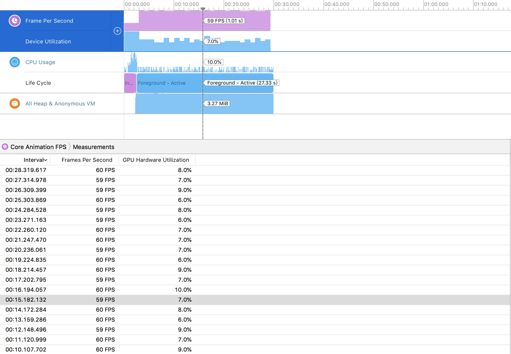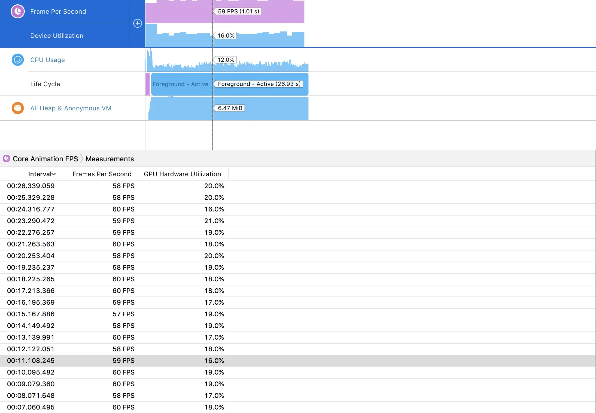 对于这么简单的动画,都是满帧运行的。因此只需要对GPU和CPU做分析比较即可。