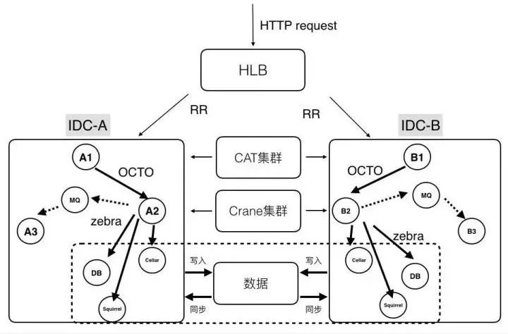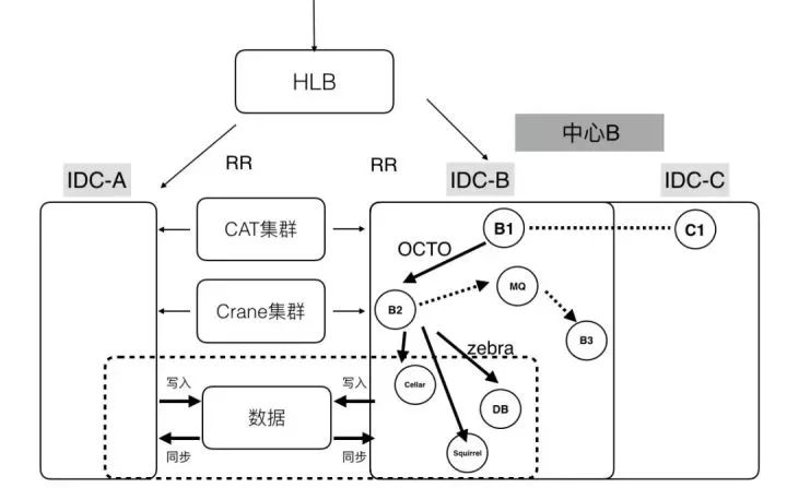 前端流量会通过HLB来分发和负载均衡;在分区内,服务与服务会通过OCTO进行通信,提供服务注册、自动发现、负载均衡、容错、灰度发布等等服务。当然也可以通过消息队列进行通信,例如Kafka、RabbitMQ。在存储层使用Zebra来访问分布式数据库进行读写操作。