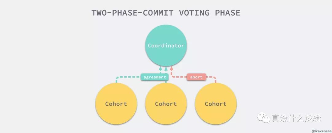 两阶段提交的执行过程就跟它的名字一样分为两个阶段,投票阶段和提交阶段,在投票阶段中,协调者(Coordinator)会向事务的参与者(Cohort)询问是否可以执行操作的请求,并等待其他参与者的响应,参与者会执行相对应的事务操作并 记录重做和回滚日志,所有执行成功的参与者会向协调者发送 AGREEMENT 或者 ABORT 表示执行操作的结果。