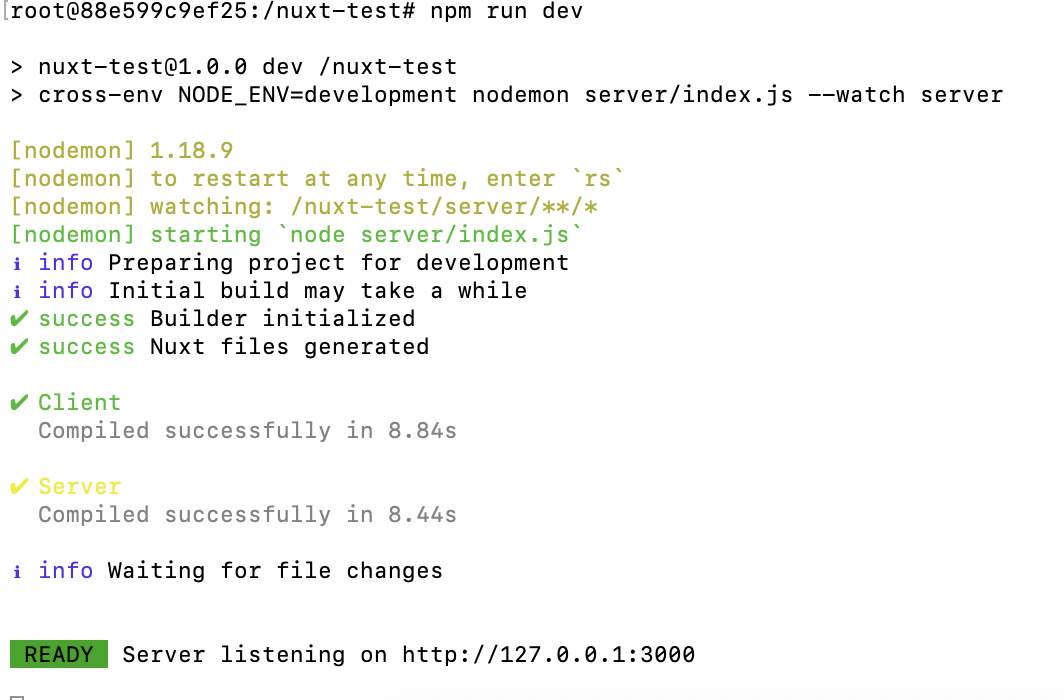 RUN npm install:在/nuxt-test目录下,运行npm install命令安装依赖。注意,安装后所有的依赖,都将打包进入 image 文件。