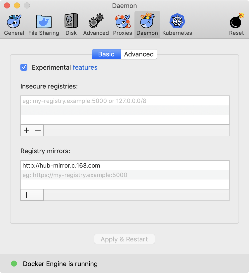 在任务栏点击 Docker for mac 应用图标 -> Perferences... -> Daemon -> Registry mirrors。在列表中填写加速器地址即可。修改完成之后,点击 Apply & Restart 按钮,Docker 就会重启并应用配置的镜像地址了。