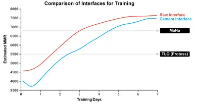 We trained two new agents, one using the raw interface and one that must learn to control the camera, against the AlphaStar league. Each agent was initially trained by supervised learning from human data followed by the reinforcement learning procedure outlined above. The version of AlphaStar using the camera interface was almost as strong as the raw interface, exceeding 7000 MMR on our internal leaderboard. In an exhibition match, MaNa defeated a prototype version of AlphaStar using the camera interface, that was trained for just 7 days. We hope to evaluate a fully trained instance of the camera interface in the near future.