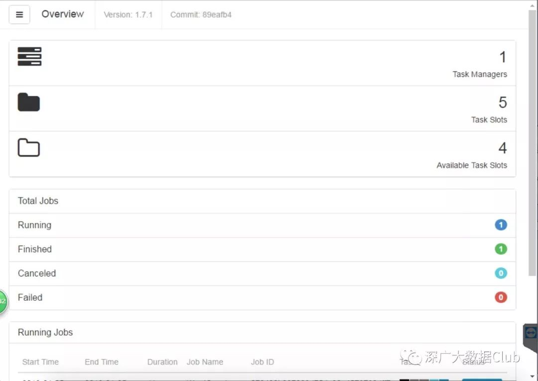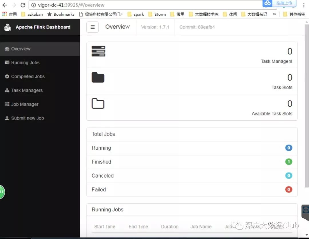 注意:部署长期运行的flink on yarn实例后,在flink web上看到的TaskManager以及Slots都为0。只有在提交任务的时候,才会依据分配资源给对应的任务执行。