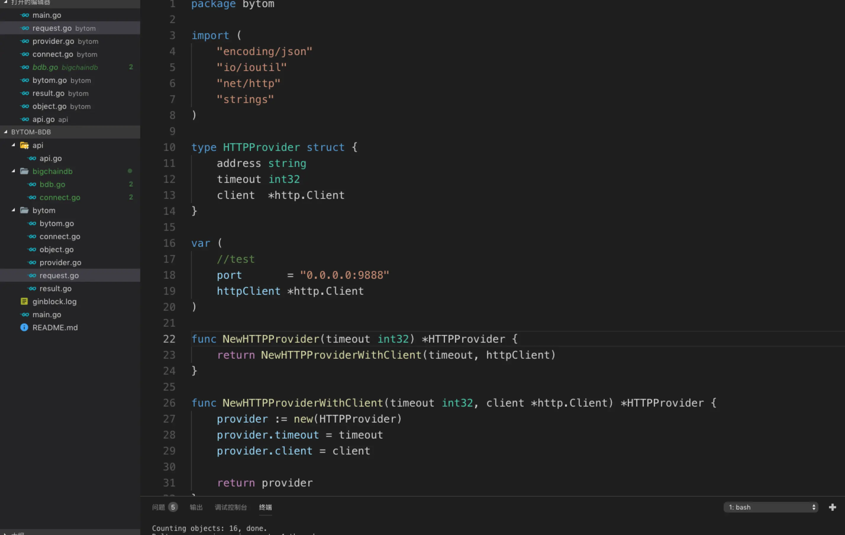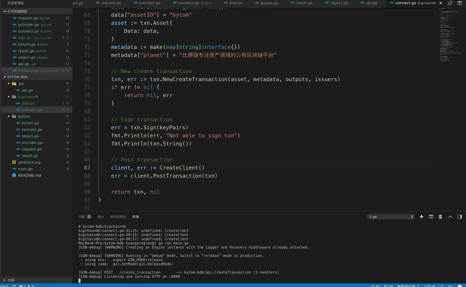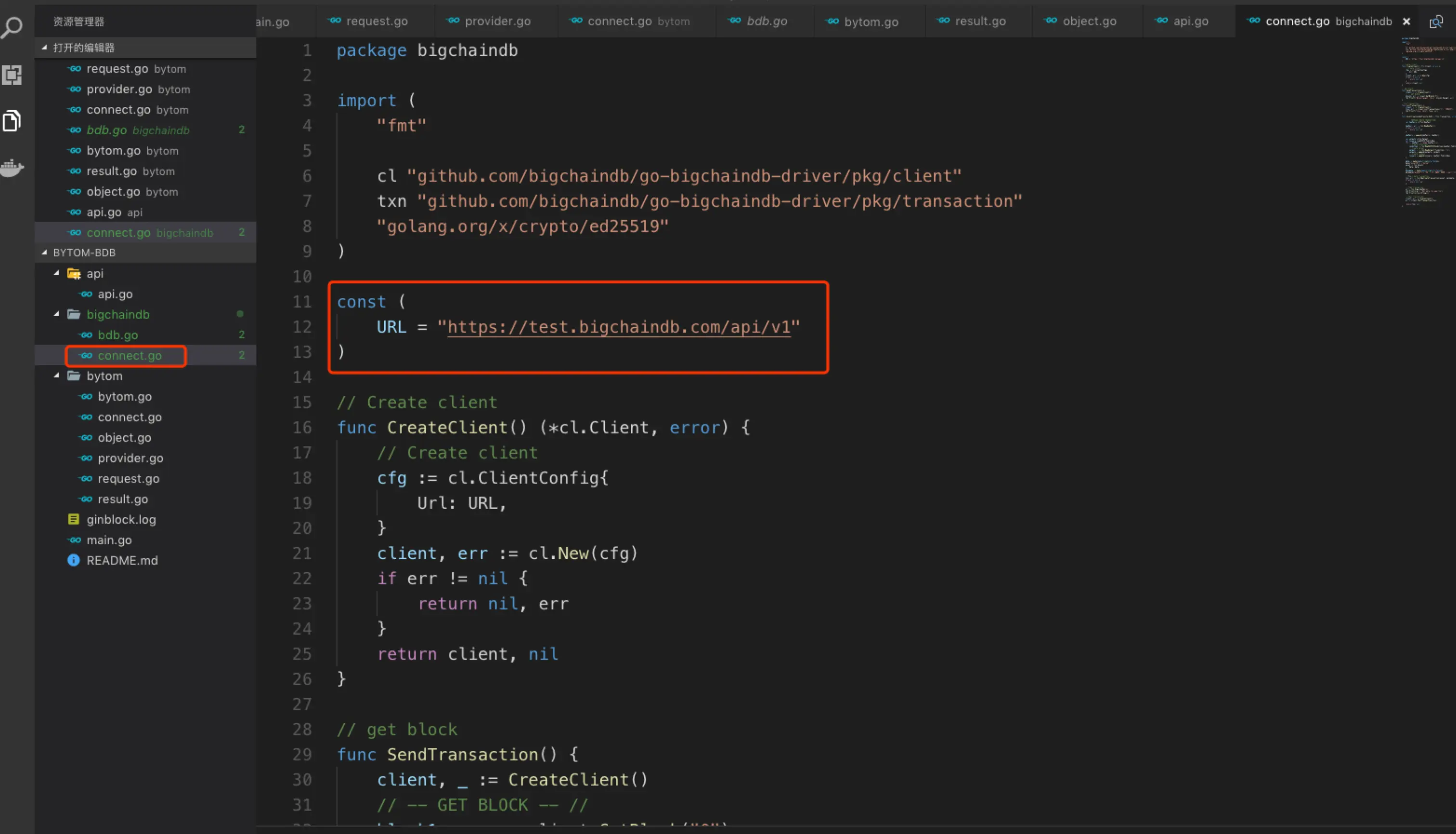 首先将自己需要的插件包下载下来放在自己的环境变量下面(我这里以golang 插件为例),然后我们跟bigchaindb的测试网进行连接。可以让我们的程序远程调用bigchaindb测试网,与之进行交互。详细的代码我们可以参考项目里面的文件,如下图: